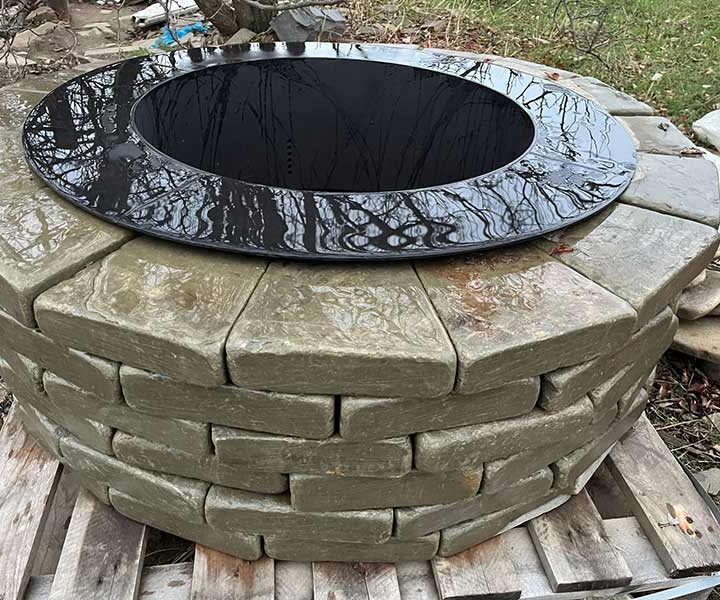 Кострище изготовлено из нескольких элементов, которые были обработаны методом галтовки, что позволило получить гладкую и приятную на ощупь поверхность.
